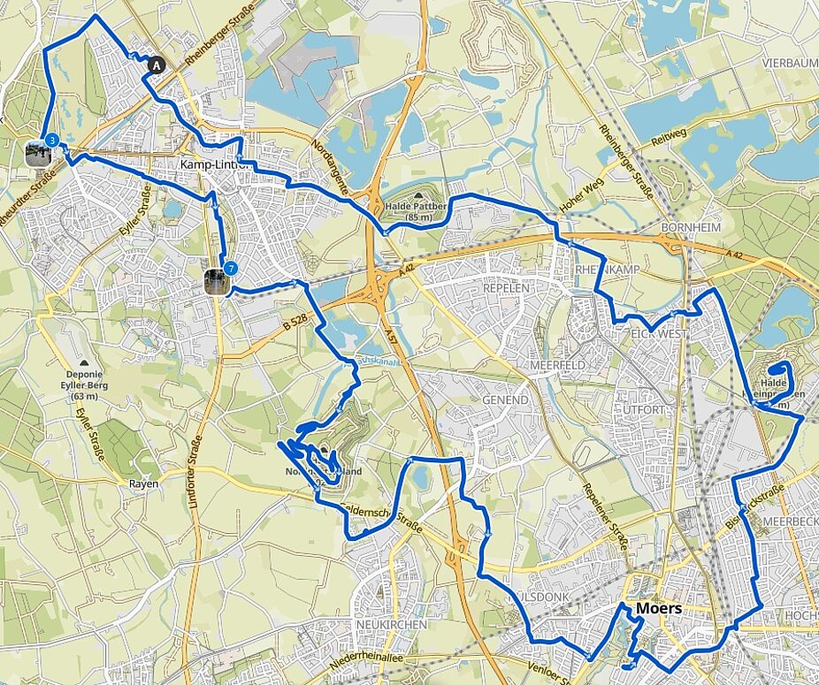 Über Moers befahren wir noch die Halde Norddeutschland, bevor wir nach ca. 45 km wieder in Rheinberg ankommen.