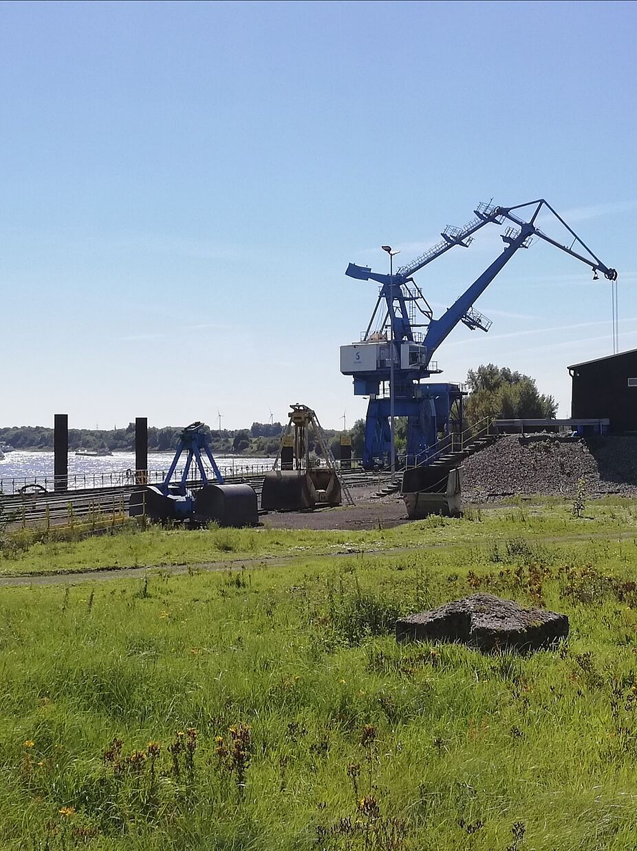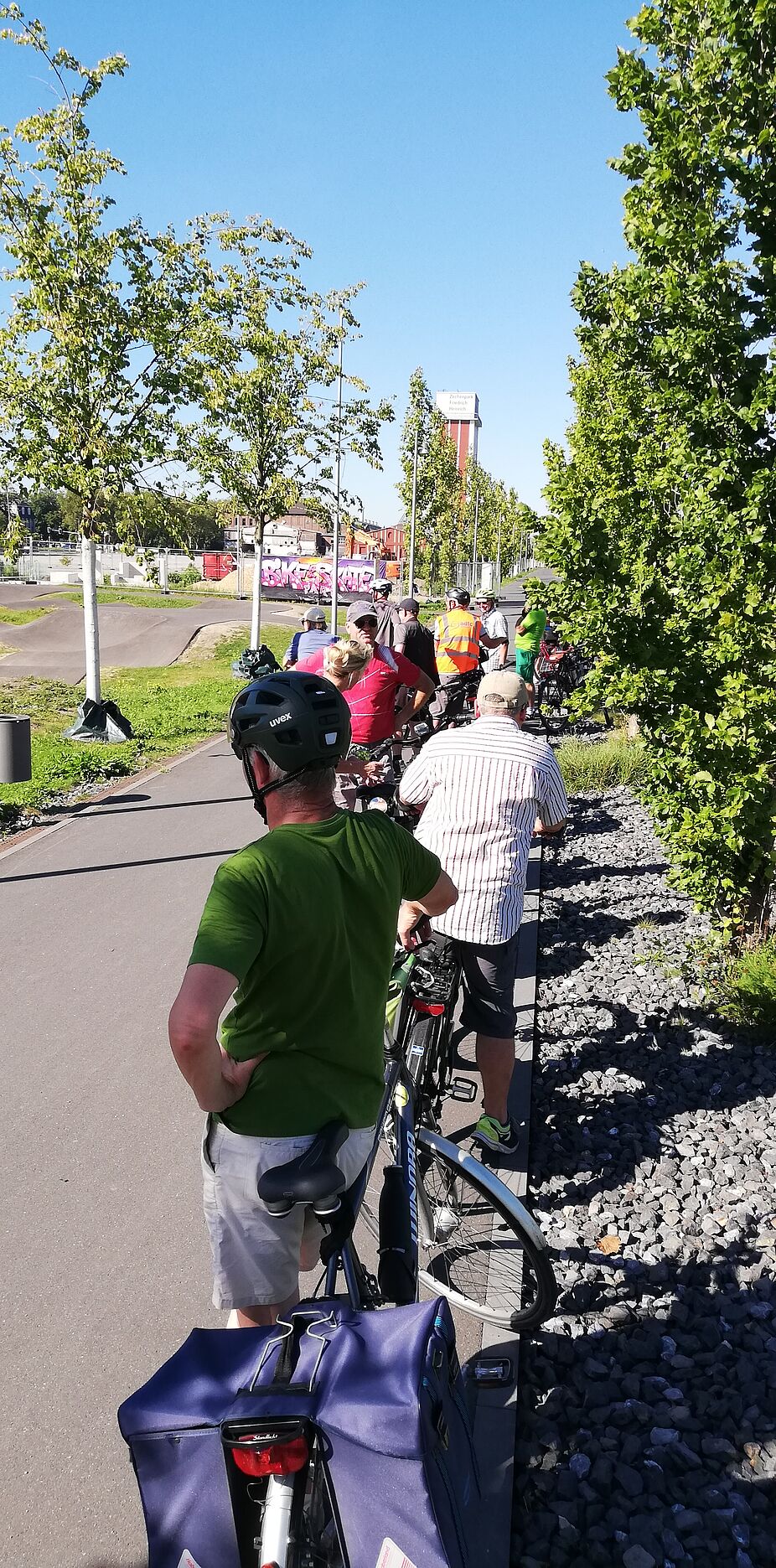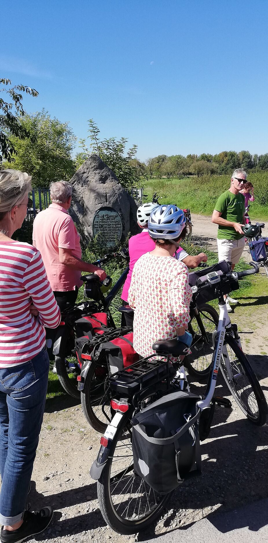 Mit 26 Radfahrenden, davon 6 RadlerInnen unserer befreundeten Weseler ADFC-Ortsgruppe, und fachkundiger Begleitung in Person von Thomas Ohl vom LVR Niederrheinmuseum in Wesel, startete die Tour vom Marktplatz in Ossenberg zum Rheinhafen „An der Momm“. Von hier wurde jahrzehntelang das weiße Gold aus dem Borther Steinsalzbergwerk mit der Grubenbahn zum Solvay-Hafen an der Momm gefahren und dort mit Kränen auf Binnenschiffe verladen, bevor die Reise auf dem Wasser fortgesetzt wurde. Seit 2014 haben den Transport nun LKW’s übernommen und im Rheinhafen werden heute nur noch Kalkstein, Anthrazit und Kohle für das Solvay-Werk angeliefert.
