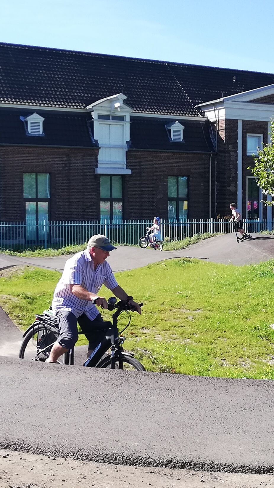 Vorbei an der Halde Pattberg, der Kohlenmischhalle mit der riesigen Photovoltaikanlage und dem alten Wasserturm der Zeche Pattberg führt uns Hans-Gerd Schroers über die Fahrrad- und Fußgängerbrücke über die Autobahn A42 Richtung Moers. Dort in der Altstadt angekommen besuchen wir das älteste erhaltene Bürgerhaus von Moers: das Peschkenhaus. 1865 hatte die Familie Peschken das Anwesen gekauft. Für uns Radfahrende besonders interessant – 1890 gründete Johannes Peschken hier eine Fahrradfabrik, die bis weit ins 20. Jahrhundert bestand.